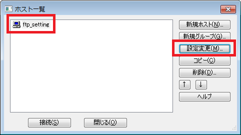「ホスト一覧」にて、ご利用中の FTP 接続設定を選択して「設定変更」をクリックします。