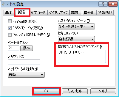 ホストの設定の「拡張」タブをクリックします。「接続時にホストに送るコマンド」にOPTS UTF8 OFFと入力し、OKボタンをクリックします。