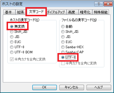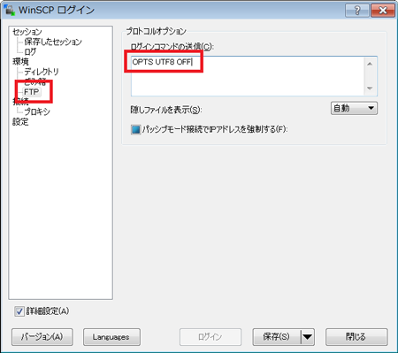 FTPクライアントソフト側でログイン時に指定コマンド(OPTS UTF8