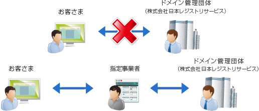 ドメインの管理は、原則としてドメイン管理団体とお客さまとの直接契約ではなく、ドメイン管理団体指定の事業者(指定事業者)を介して登録情報を管理します。