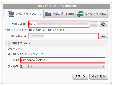 3 【リポジトリをクローン】をクリックし、各項目を入力します