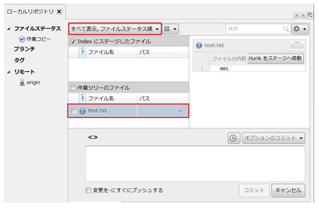 5 表示の絞り込みで【すべて表示】を選択すると、ローカルリポジトリ内でファイルの変更(新規作成/修正など)があれば、下図のように対象ファイルが表示されます