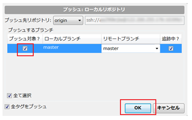 9 「プッシュ対象?」にチェックを入れ【OK】をクリックすると、リモートリポジトリにpushできます