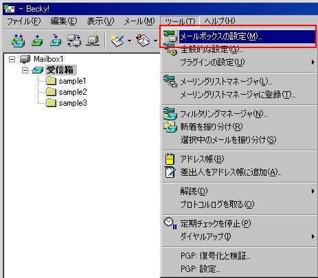 1 Becky! を起動し、メニューバーにて【ツール】>【メールボックス】とクリックします