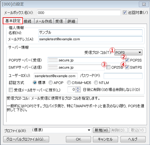 | ①受信プロトコル | POP3を選択します |
