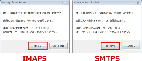 - IMAPS、SMTPSにチェックを入れると、それぞれ下記の画面が表示されますので、いずれも【はい】をクリックしてください