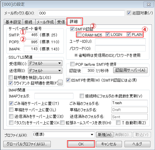| ④各チェックボックス | LOGIN、PLAINにチェックを入れてください |