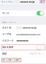 2 「SSLを使用」をオフにして、サーバーポートを587に変更して【完了】をタップします