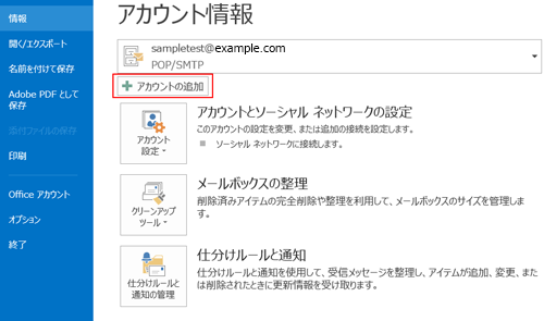 1 Outlook 2013を起動し、メニューバーにて【ファイル】>【情報】>【アカウントの追加】とクリックします