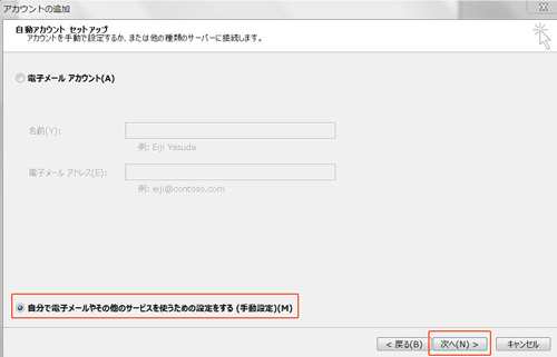 2 「自分で電子メールやその他のサービスを使うための設定をする(手動設定)」を選択して【次へ】をクリックします