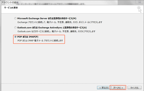 3 「POPまたはIMAP」を選択して【次へ】をクリックします