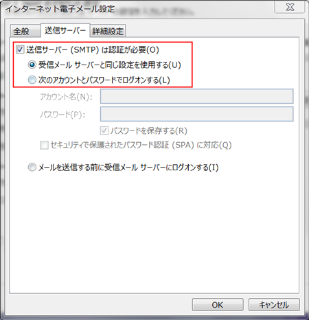 2 【送信サーバー】の「送信サーバー(SMTP)は認証が必要」にチェックを入れて【OK】をクリックします