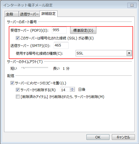 ■【詳細設定】の受信サーバーを995、送信サーバーを465に変更します。