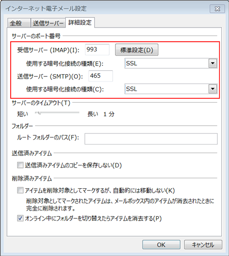 2 【詳細設定】にてポート番号および暗号化接続の設定を行います