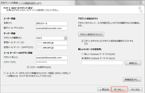 1 「ユーザー情報」「サーバー情報」「メールサーバーへのログイン情報」を入力して【詳細設定】をクリックします