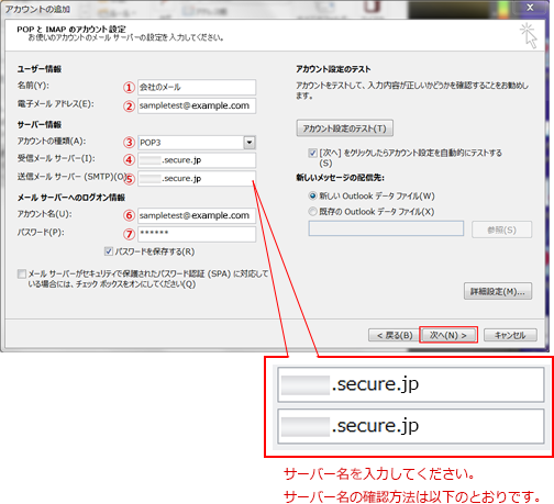 | ③アカウントの種類 | POP3 または IMAP からお選びください。 |