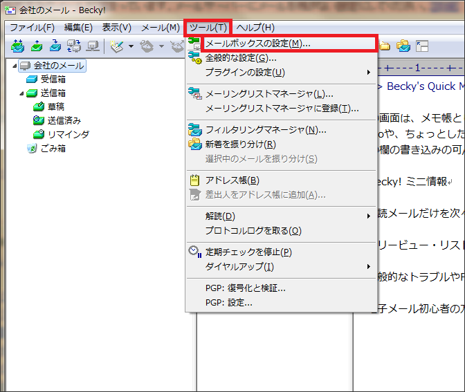 1 Becky! を起動し、メニューバーにて【ツール】>【メールボックスの設定】の順にクリックします。