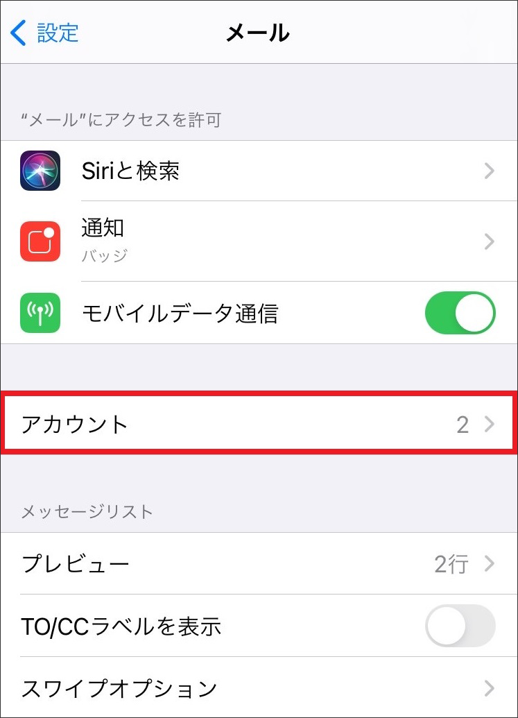 3 【メール】画面が表示されたら、【アカウント】をタップします。