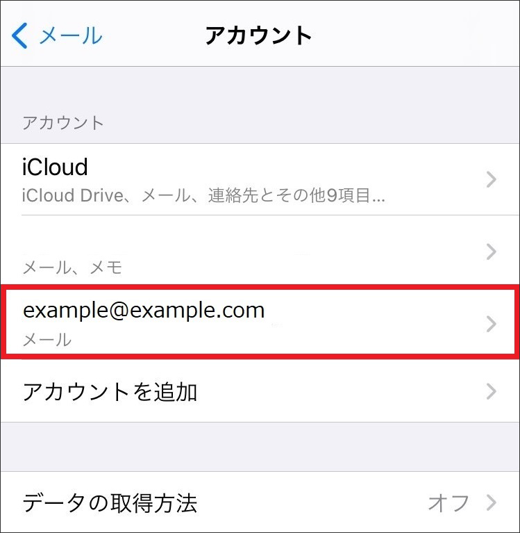 4 【アカウント】画面が表示されたら、設定確認を行うメールアカウントをタップします。