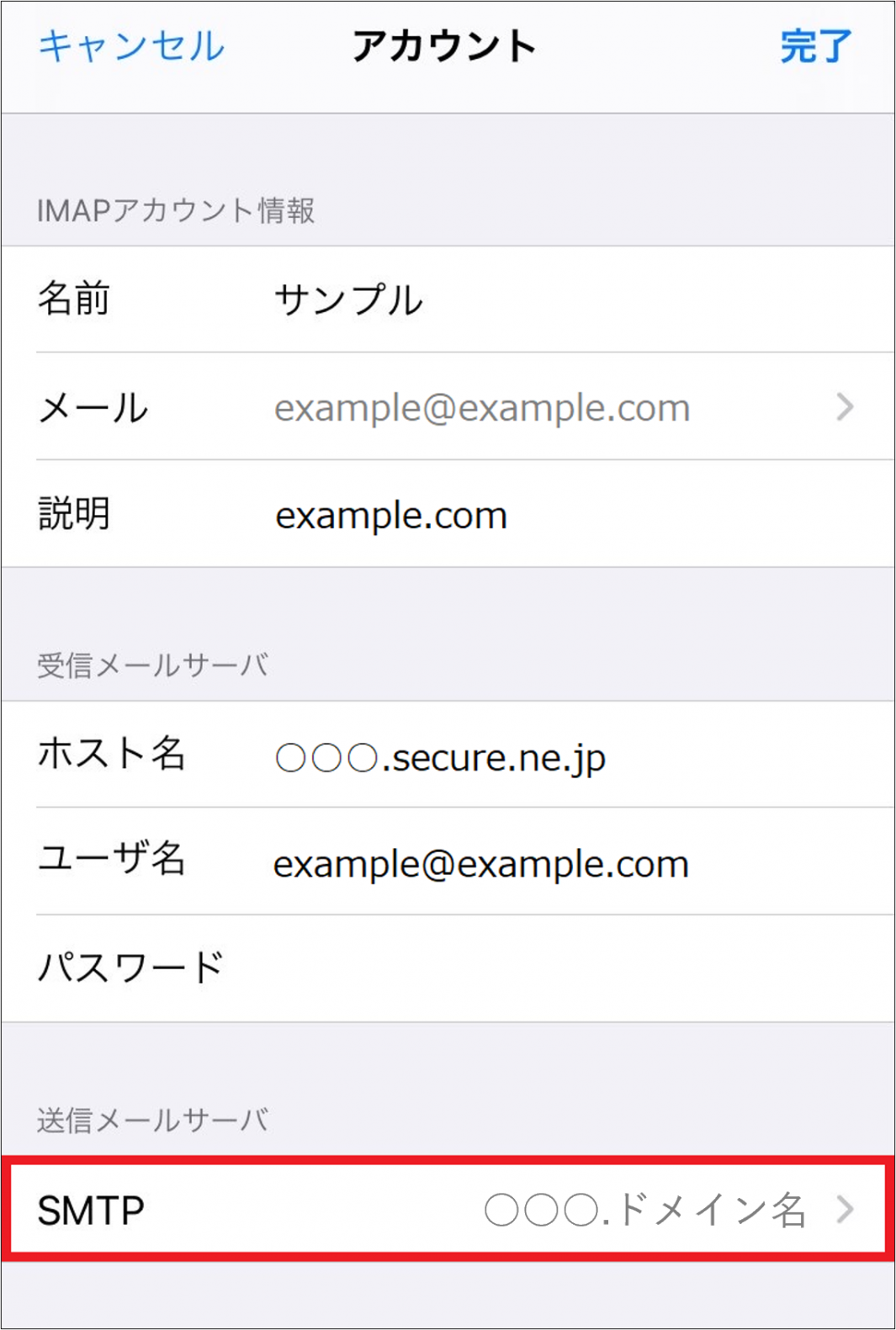 7 変更後、同画面下部にある【送信メールサーバー】の【SMTP】をタップします。