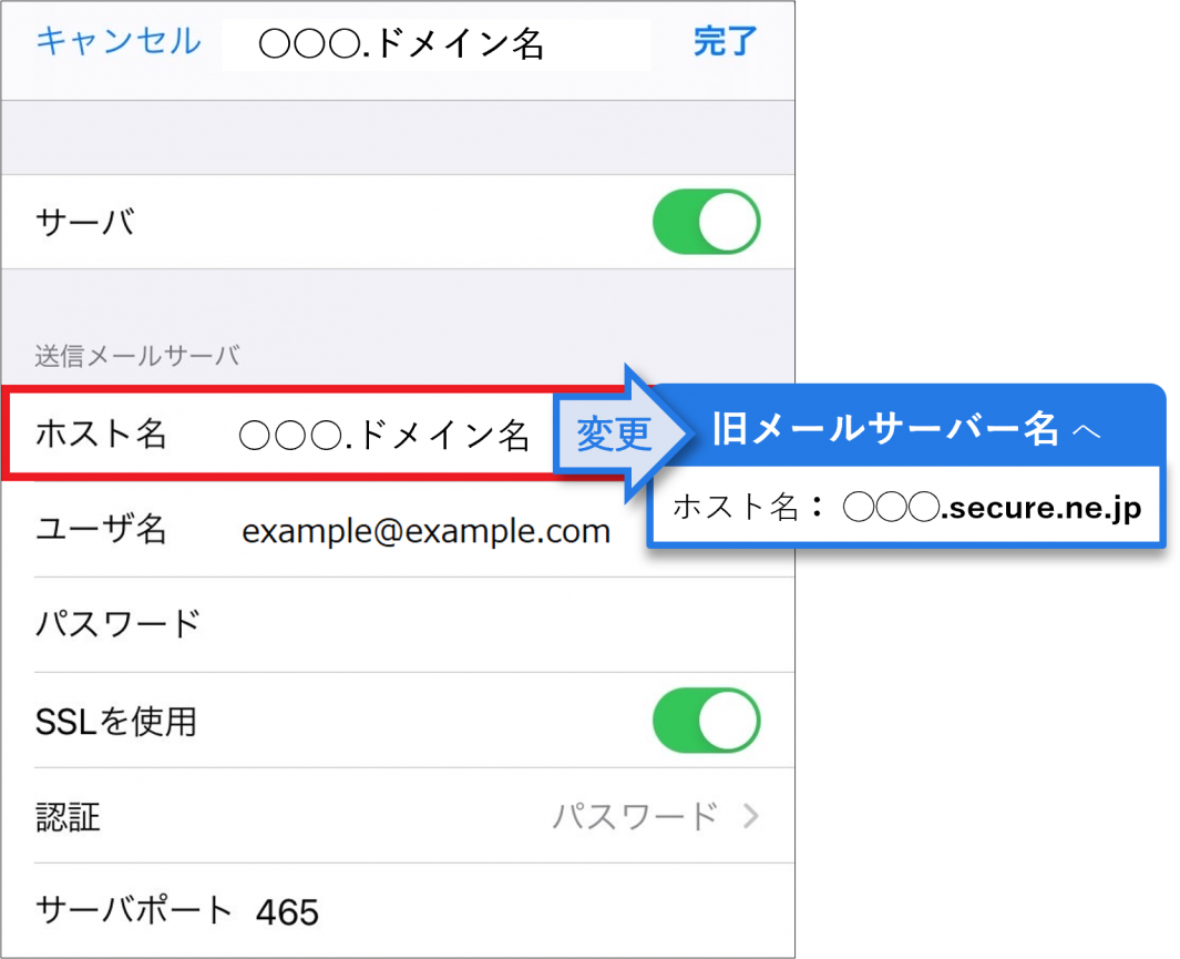 ドメイン名で設定されている場合はタップして、旧サーバー(移転元サーバー)のメールサーバー名へ変更します。