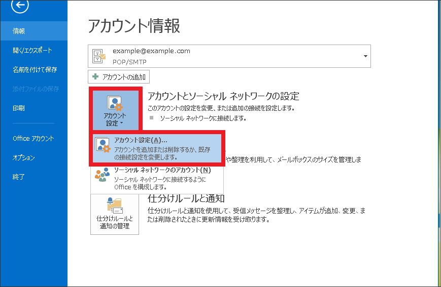 次に表示される【アカウント情報】画面で、【アカウント設定】>【アカウント設定(A)】をクリックします。