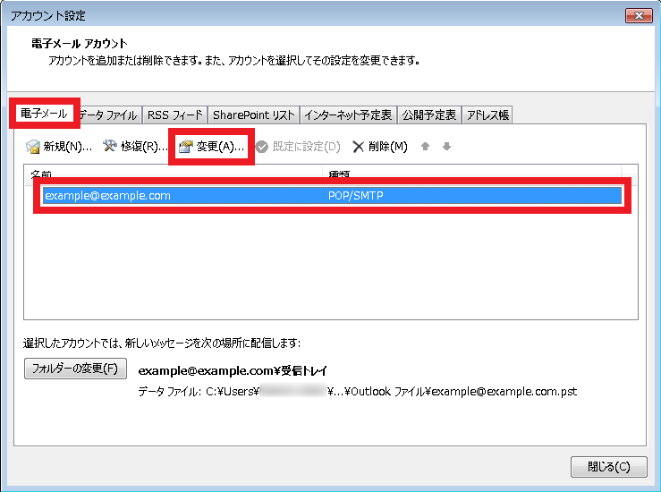 【電子メール】タブをクリックし、設定確認を行うメールアドレスを選択してから【変更】をクリックします。