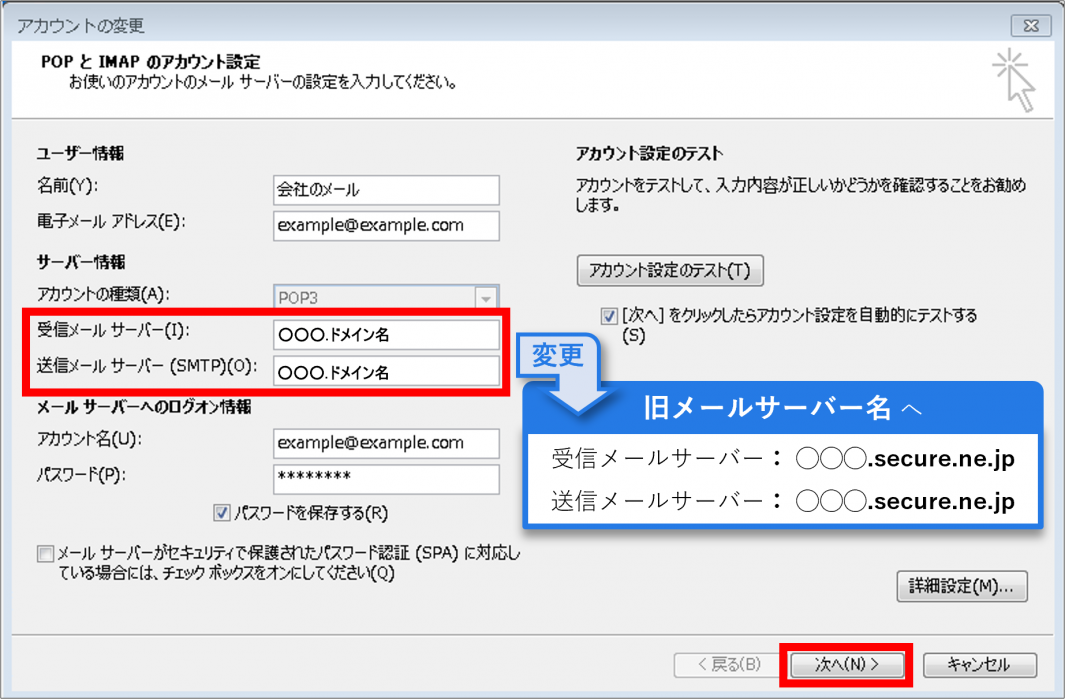 ドメイン名で設定されている場合は旧サーバー(移転元サーバー)のメールサーバー名に変更して、 【次へ】をクリックします。