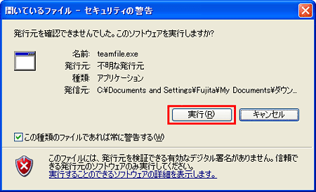 ダウンロードしたアプリケーション実行ファイル「teamfile.exe」をダブルクリックし、ソフトウェアの【実行】ボタンをクリックします。