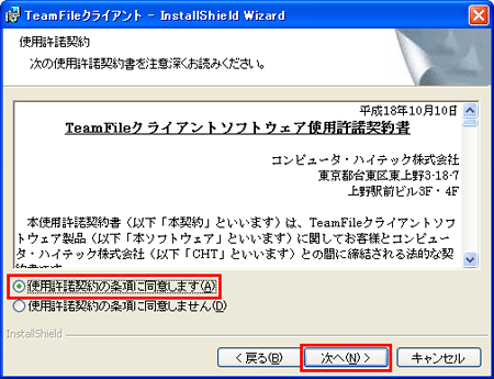 4 「使用許諾契約の条項に同意します」を選択し、【次へ】ボタンをクリックします。