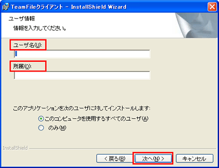 5 「ユーザー名」と「所属」を入力し、【次へ】ボタンをクリックします。