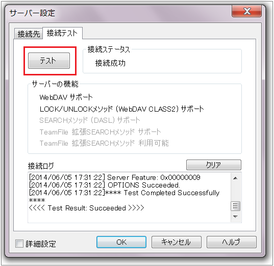 ここで、正常にWebDAVに接続できるかチェックします。【テスト】ボタンをクリックし、「接続ステータス」に「接続成功」と表示されれば接続設定は完了です。
