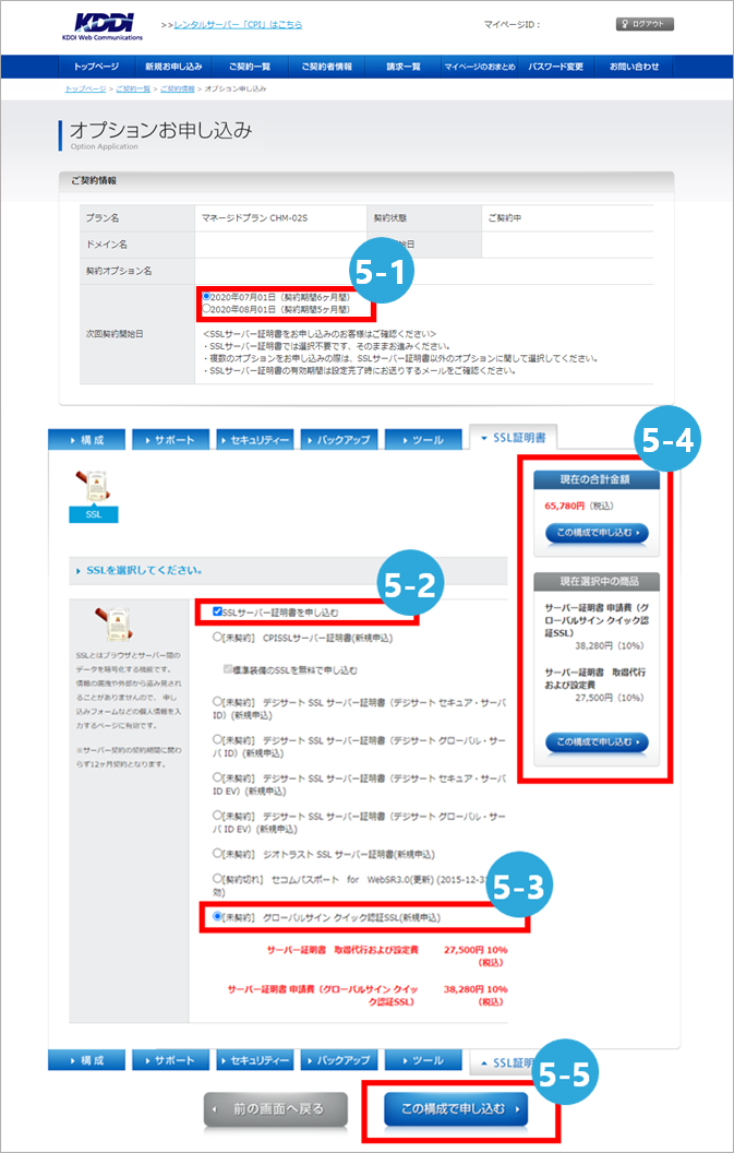 - 5-3 「【契約中】グローバルサイン SSLサーバー証明書(更新)(有効期限日)」を選択
