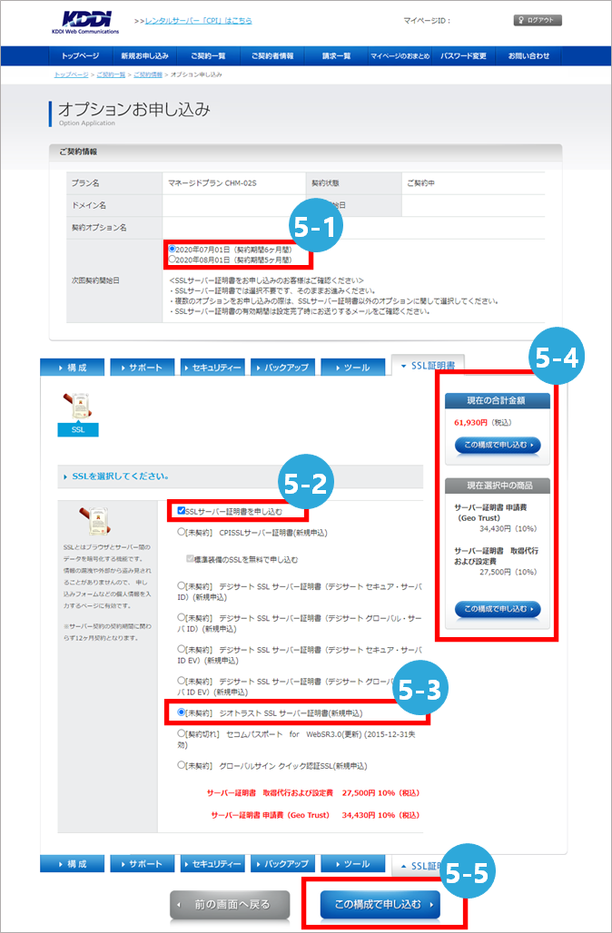 - 5-3 「【契約中】ジオトラスト SSLサーバー証明書(更新)(有効期限日)」を選択