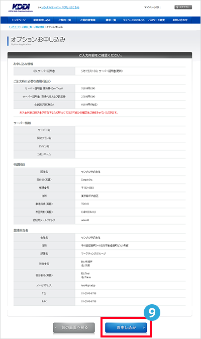 - ご申請情報の確認画面にて登録内容に間違いがないかご確認のうえ、問題がなければ「お申し込み」ボタンを押して更新の手続きを完了させます。