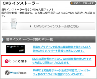 1 コントロールパネルの「CMS インストーラー」から a-blog cms を選択します。