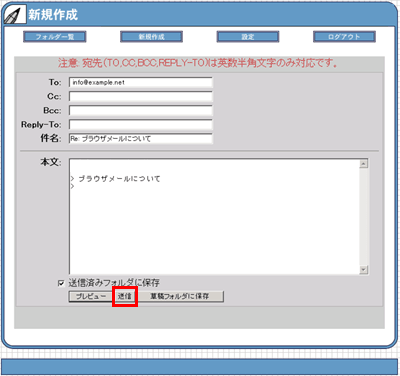 2 受信した内容が引用された状態で、メール作成画面が表示されます。メッセージを入力して、【送信】ボタンをクリックします。