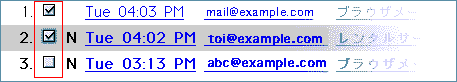 メール一覧表示の左側にあるチェックボックスで削除するメールを選択してください。