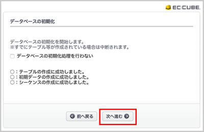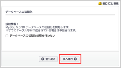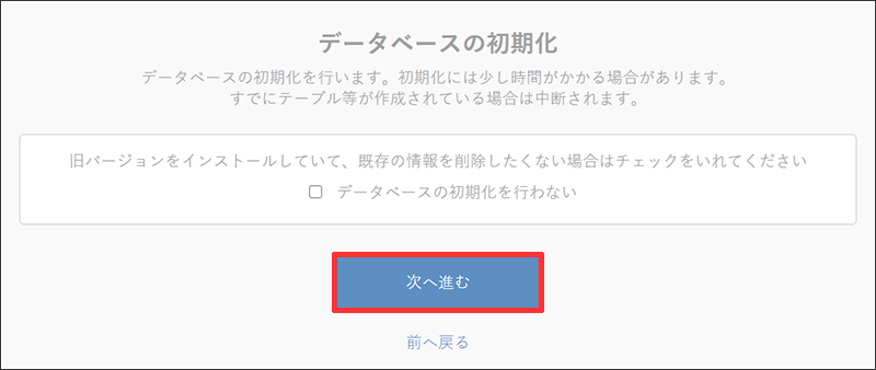 初期化しない場合は、データベースの初期化処理を行わないにチェックを入れて「次へ進む」をクリックします。