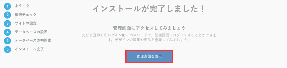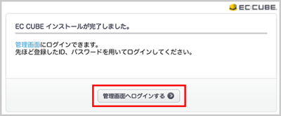 11 以上で EC-CUBE のインストールは完了です。「管理画面へログインする」をクリックします。
