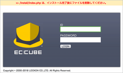 - インストール後は、FTP クライアントソフト等を使用して、/install/index.php ファイルを削除してください。