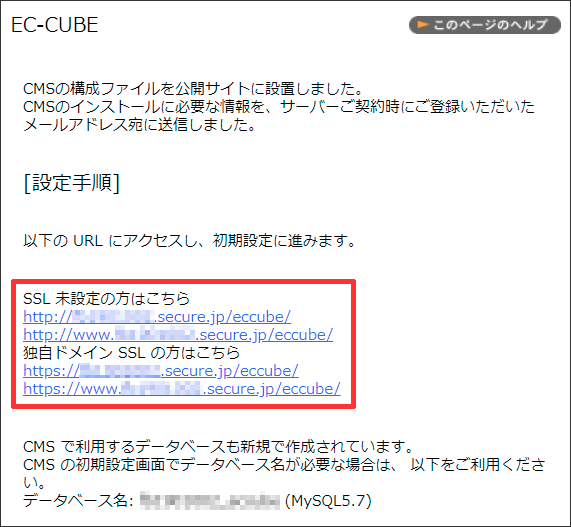 | データベースユーザ | サーバー設定完了メールに記載のあるデータベース情報のユーザー名 |