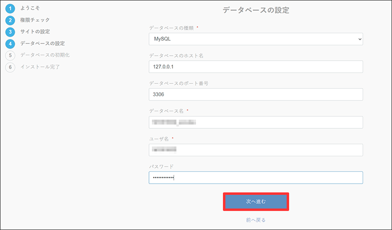 7 データベースの設定です。各項目を入力して次へ進むをクリックします。