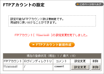 これで FTP アカウントが作成されました。 【FTP アカウント名】 がお客さまのFTPアカウントとなります。
