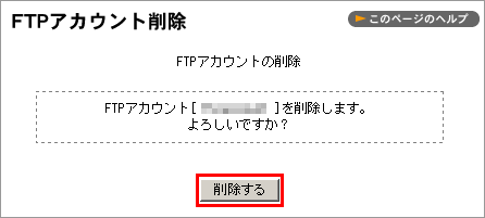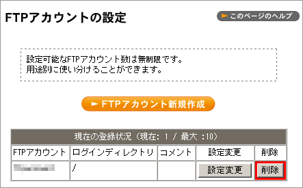2 削除したい FTP アカウントの【削除】ボタンをクリックします。