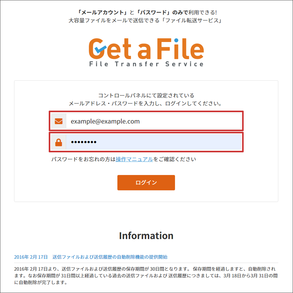・「Get a File」で送信したファイルと送信履歴は、 30 日間サーバーに保管されます。30 日間を過ぎますと自動的に削除されます。