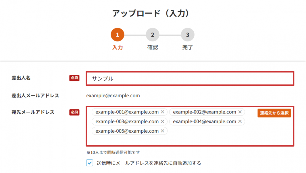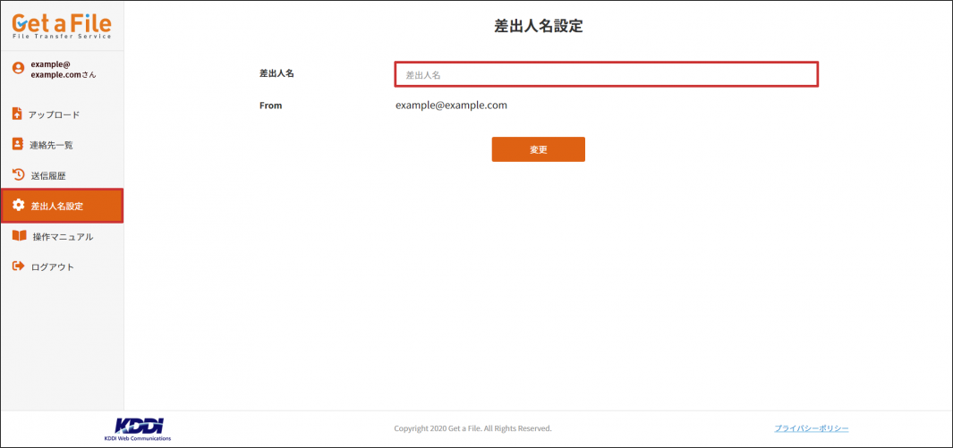 差出人名を指定すると、アップロード画面の差出人欄に自動で入力されます。