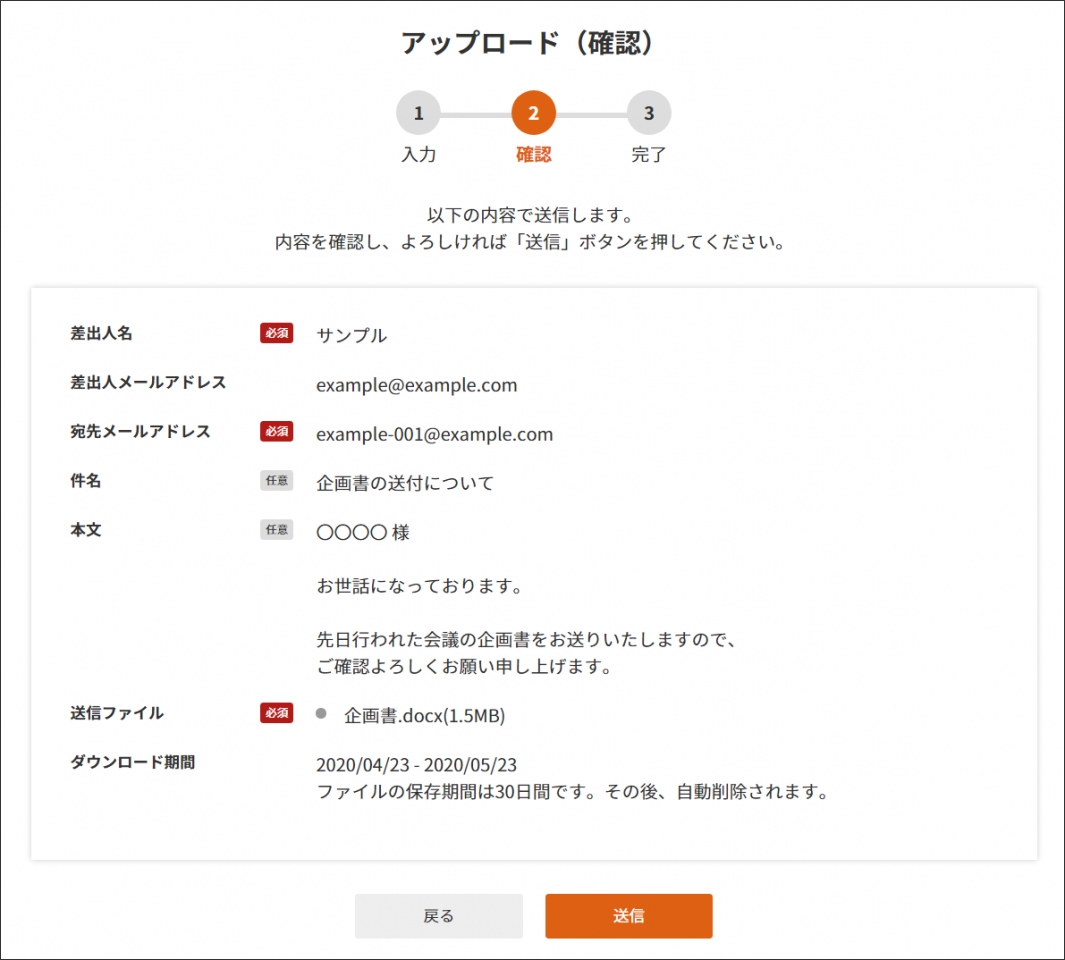 2 画面が【アップロード】へ移り、 ファイルのアップロードの手順で送信を行えます。