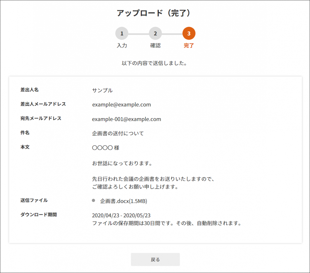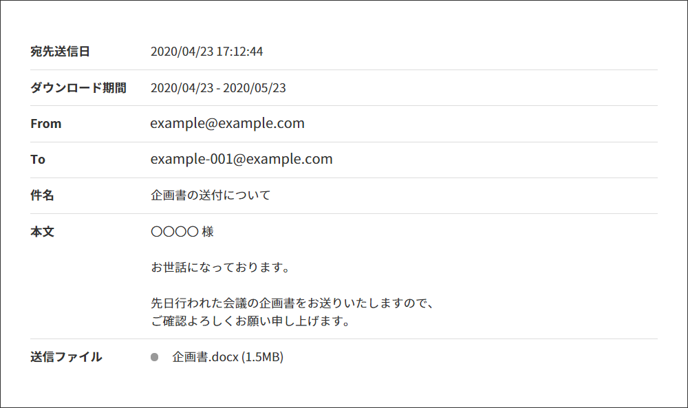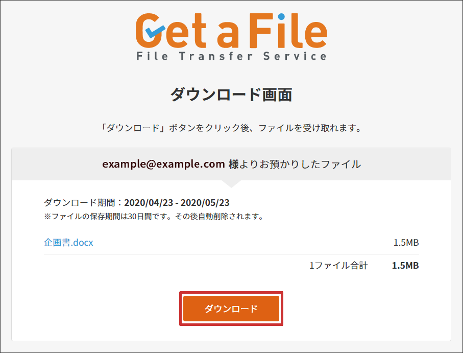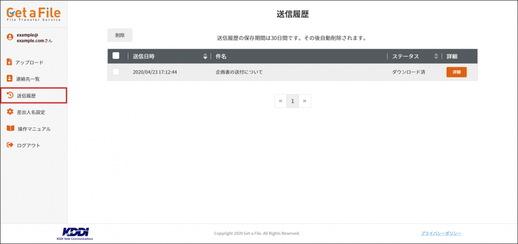 「Get a File」で送信したファイルと送信履歴は、30 日間サーバーに保管されます。30 日間を過ぎますと自動的に削除され、送付先からのダウンロードも行えなくなります。