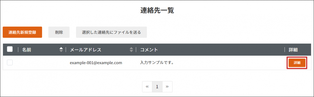 1 連絡先一覧から、登録済みメールアドレスの左端のチェックボックスにチェックをいれ、【選択した連絡先にファイルを送る】をクリックします。